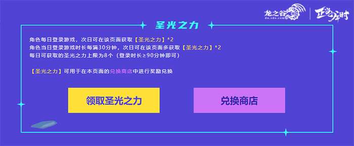 在3月10日至3月27日期间,95级角色(需完成二转)当天登录《龙之谷》游戏并满足特定时长,次日就能在活动页面领取圣光之力,每天最多可领取到8个圣光之力。在3月27日前,凭累积的圣光之力,可以在页面的兑换商店内,兑换到超实用的道具。希望之花、公会之力、女神币、保护药、女神黄昏宝箱、女神纹章鉴定书,甚至还有三孔无属性的祝福之杰兰特项链。各个道具的可兑换次数不同,记得好好分配,尽可能多的换取对自己来说最有用的奖励吧~