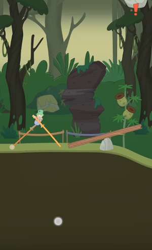 2、控制角色到达跷跷板位置后,当高跷接触到跷跷板的时候上面就会有一个大石头掉下来砸到跷跷板的另一端,将角色击飞,这个时候点击屏幕进行跳跃,一鼓作气飞往对岸;