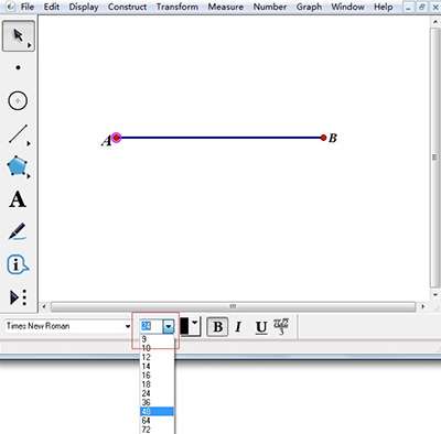 文本工具栏打开后,选中所要改变标签大小的对象,在下方字号框修改。这儿还是以线段AB为例,操作如下:选中点A,此时下方的文本工具栏即可被激活,成可编辑状态,就能在字号框里面选中合适的字号,来增大或者缩小标签A。