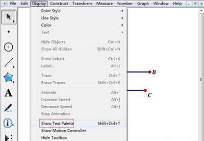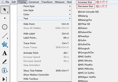 选中要改变的标签所代表的图,如点或线之类的,在几何画板窗口最下方的文本工具栏对字体进行设置。几何画板默认设置是打开时,不自动在下方显示文本工具栏,所以在使用之前,要将其打开,在“显示”菜单下选择“显示文本工具栏”,如图所示。