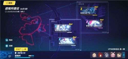 特殊玩法,主线剧情解锁第六关后开启,玩家每天有4次机会挑战特殊关卡,完成后可获得材料以及避难所的等级。避难所等级越高每小时收获的活动材料也就越多。当使用up女武神出战后,会获得额外的积分奖励。