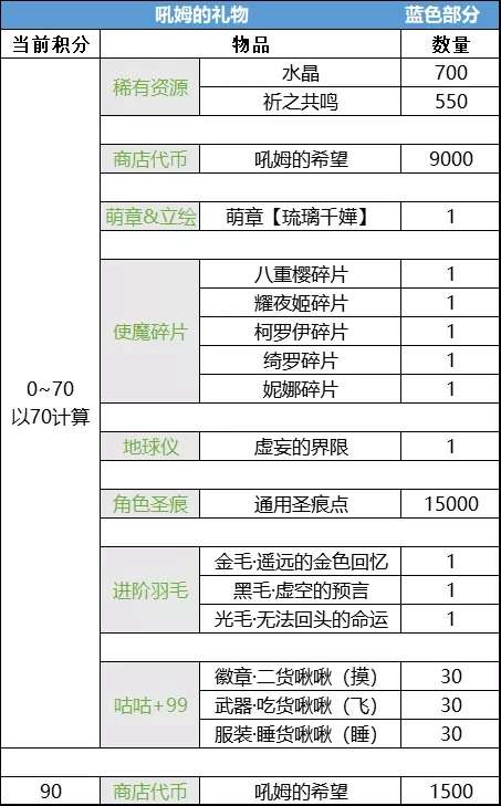 蓝色部分的奖励是玩家普遍可以获得的,只要跟随活动进行,至少70个积分是相对容易的,首先来看蓝色部分的主要奖励: