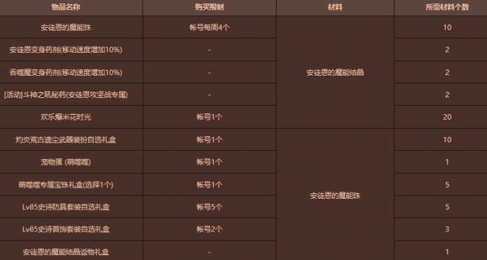 * 活动材料可以兑换为安徒的魔能珠,用于兑换商店奖励