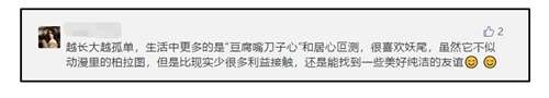 “很喜欢妖尾,虽然它不似动漫里的柏拉图,但是比现实少很多利益接触,还能找到一些纯洁美好的友谊。”