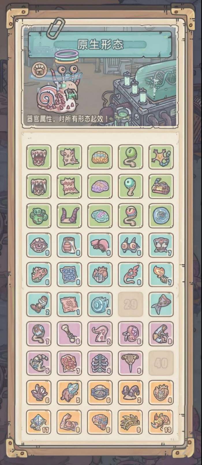 各种颜色器官数量,绿色15个,蓝色15个,紫色10个,橙色10个,红色5个,下图为器官界面。