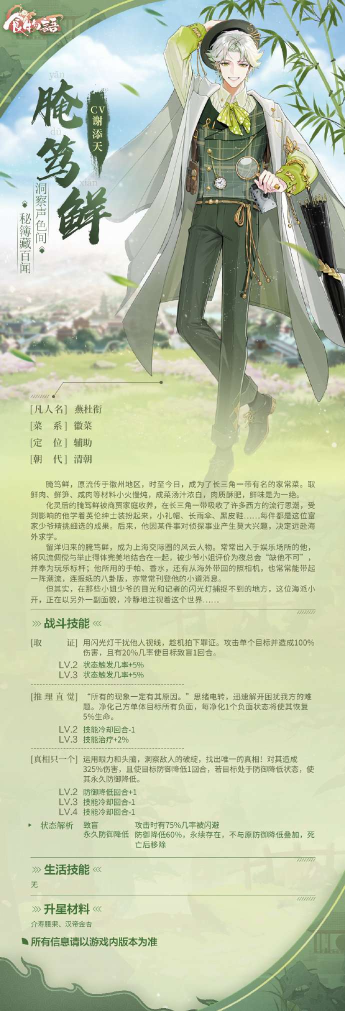 食物语腌笃鲜是马上要出的新食魂,虽然只有珍级别稀有度,但是他有一个全新的技能机制,永久降低敌人防御,那么食物语腌笃鲜值得培养吗?可以在哪些副本使用?下面小编就和大家分析一下: