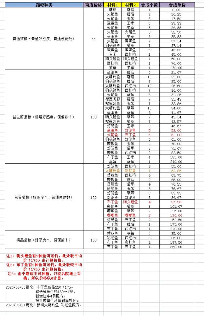 这是自制猫粮的配方以及价格汇总。大家可以根据需要选择合适的配方来制作。顺便说一下,蘑菇不是很容易获得,不要看它不要钱就想一直用它合成。