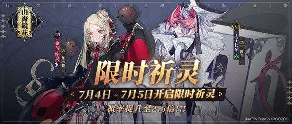 1、【周末限时祈灵】活动时间:7月4日00:00——7月5日23:59,期间开放【SSR镜灵-太子长琴】【SR镜灵-金乌·仲灵】限时祈灵,且SSR太子长琴、SR金乌·仲灵出现概率提升至2.5倍。
