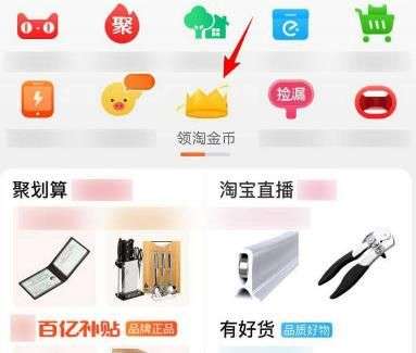 首页为各种游戏及功能入口,还有商品广告,金币庄园是在功能入口的中间,点选“领淘金币”;