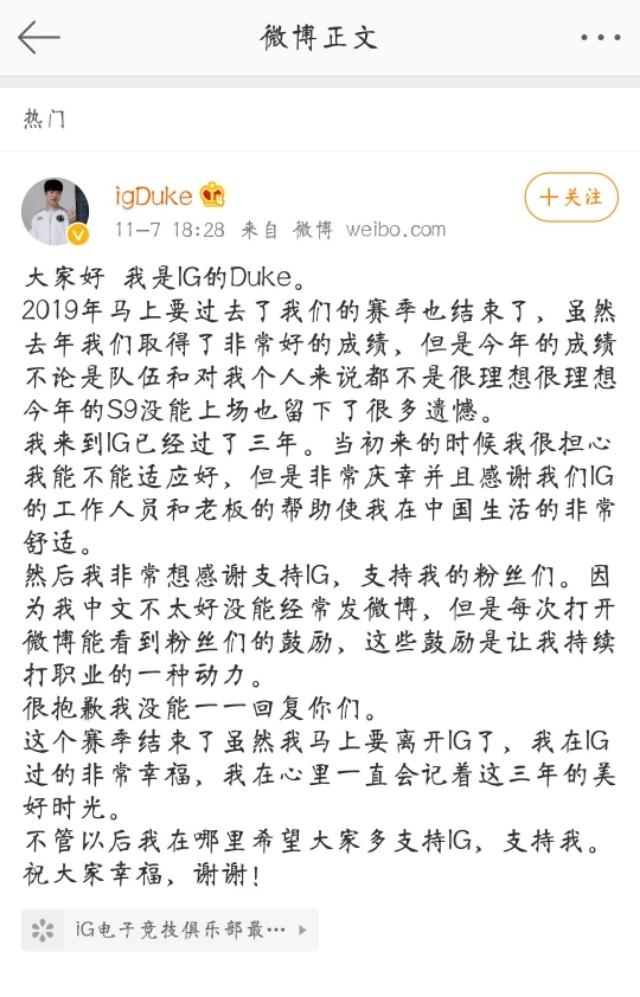 有很多人说duke将要离开ig这事情引起网友注意,还有人爆料有位选手还会回去做教练。就在这短暂的等待期间,IG的上单选手Duke,发布微博表示自己即将离开IG。