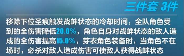三件套则是提升了增幅影舞与这套圣痕的契合度,首先移除了战衅状态的CD,不再有真空期;其次特别注明芽衣装备时,角色不在场的状态下只使用必杀技也可以给敌人施加战衅状态,而最适配这条效果的无疑是增幅影舞,实战中增幅影舞释放大招后就可以在后台多次触发战衅,将更多的时间留给主C进行输出。