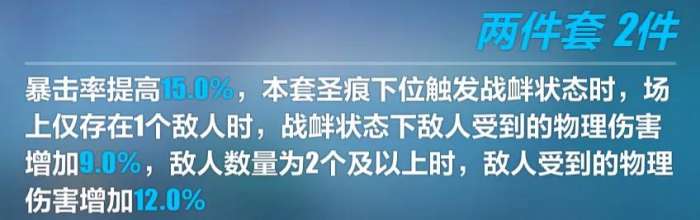 二件套能提升角色15%的暴击率,数值不错,增幅影舞自身也有非常多的暴击率加成,配合武器圣痕在实战中可以做到很“黄”。第二个效果则进一步强化了辅助能力,单个敌人时战衅状态可以额外附加9%的物理易伤,多个敌人则附加12%,再配合下位自带的12%全伤害易伤,总体的辅助效果极为恐怖。