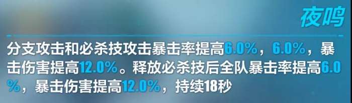 1)分支与必杀有6%的暴击率加成,弥补了武器低会心的缺陷,且有12%爆伤加成,提升输出能力。2)释放必杀技后提升全队18秒的6%暴击率与12%爆伤,持续时间非常长,契合了增幅影舞长线辅助的特性,且进一步提升了增幅影舞的输出能力。同时也有一定的泛用性,让别的太刀主C也可以带着这把武器进行输出。