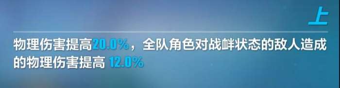 首先是无条件的20%物伤加成,数值较低;但另一条效果就比较重要了:全队对战衅状态敌人提升12%物伤,数值上再次超越了老牌圣痕特斯拉乐队上,且这个效果是全队的,这意味着这件上位可以给自身带来32%的物伤加成,非常契合增幅影舞的辅C定位。