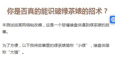 你是否真的能识破绿茶婊的招数?这是最近非常火爆的一个选择测试,很多朋友参与测试但还是有很多问题不是很理解,别着急,本篇就为大家带来你是否真的能识破绿茶婊的招数答案大全!
