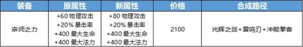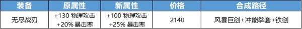 这件装备本身拥有暴击流所需最关键也是无可替代的被动效果:增加暴击效果。但过高的攻击使得它可以无视装备间的联动收益,出现在大量的出装当中。所以我们尝试对它作出一定的调整以解决过高的泛用性问题,希望装备间的组合能更加具备联动收益,增加乐趣。
