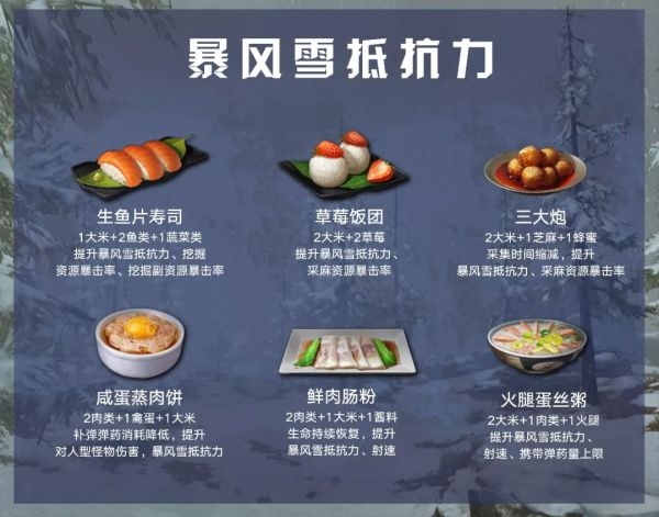 请带上提升暴风雪抵抗力的料理,或许它将会是你在严寒之中平稳前行的关键。