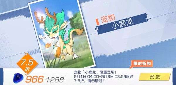 9月1日04:00 - 9月8日03:59,新萌宠【小鹿龙】上架商城,登场首周限时7.5折优惠哦~