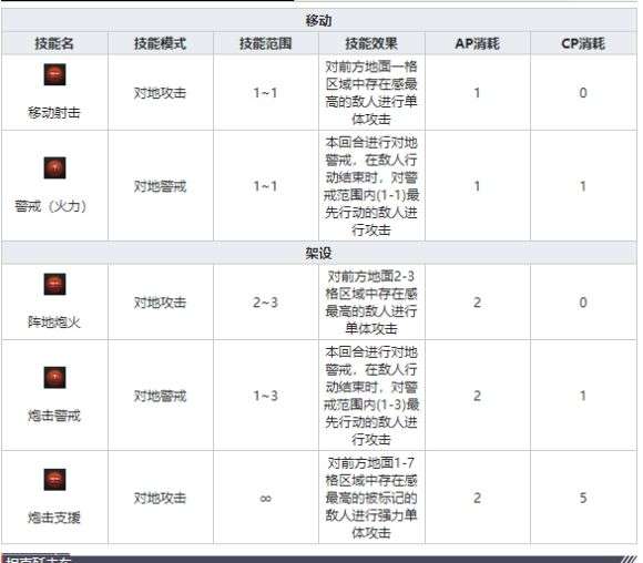 这里解释两个名词:1:架设状态:消耗2点AP后由移动形态转换成架设形态,坦克单位前4组技能一般不怎么用架设状态,因为差别不大,但火炮就差别很大,直观上直接影响攻击范围。