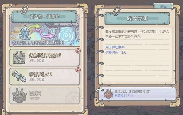 1、在10月9日5:00-10月16日4:59期间换取特殊活动祭品-敦煌焚香。(“水晶大作战”活动第一档奖励,花费500灵能水晶兑换获得)
