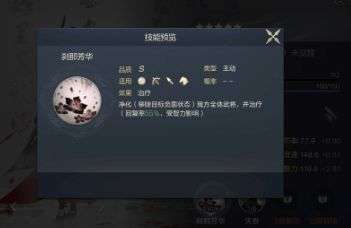 净化(移除目标负面状态)我方全体武将,并治疗(回复率32.5%,受智力影响)