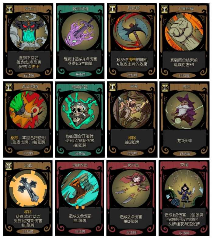 【罗生门】骑士第一神器。非极简必拿。【吸血鬼剑】骑士第二神器。非极简必拿。【旋风斧】强力输出牌,过渡神器。【力量祝福】最强增伤牌。