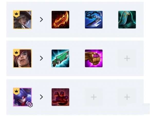 阵容前期我们优先抢反曲之弓,腰带,两件装备任意一件都可以。抢到反曲之弓,做巨杀羊刀,抢到腰带做日炎,狂徒,基克的先驱,把前期可以合的装备都先和合了用于过渡。