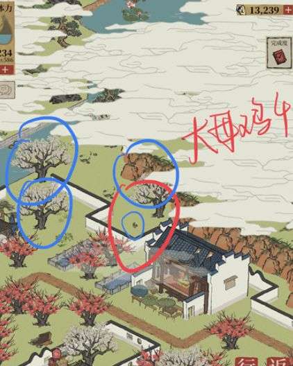 大母鸡位置:南北行旁边、山茶树园内、巽塔旁边、戏台旁、迷言里(白公狸迷雾后)。