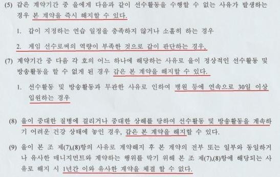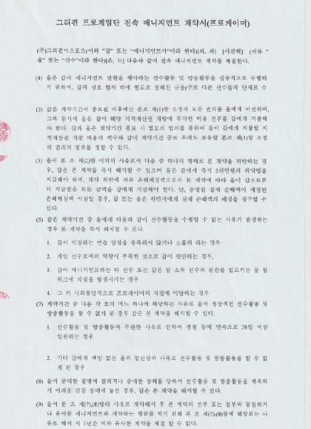 4、如果我们认为你现在的表现不好,那么我们可以随时终止你的合同。 5、如果无法与队员取得联系,则队员将立即被踢出队伍,并将罚款5000万韩币(相当于工资的2.5倍),并将所有的剩余工资退还给队伍。