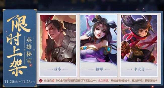 四、1200金币英雄秘宝于11月20号上架,此次加入宝箱的三位英雄分别是18888吕布,以及貂蝉和李元芳两位13888英雄,若金币充足又对铭文碎片有需求的玩家可尝试抽取!