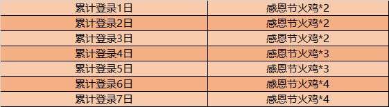 累计登陆7天分别可以领取2、2、2、3、3、4、4个火鸡,加起来一共可以获得20个火鸡。