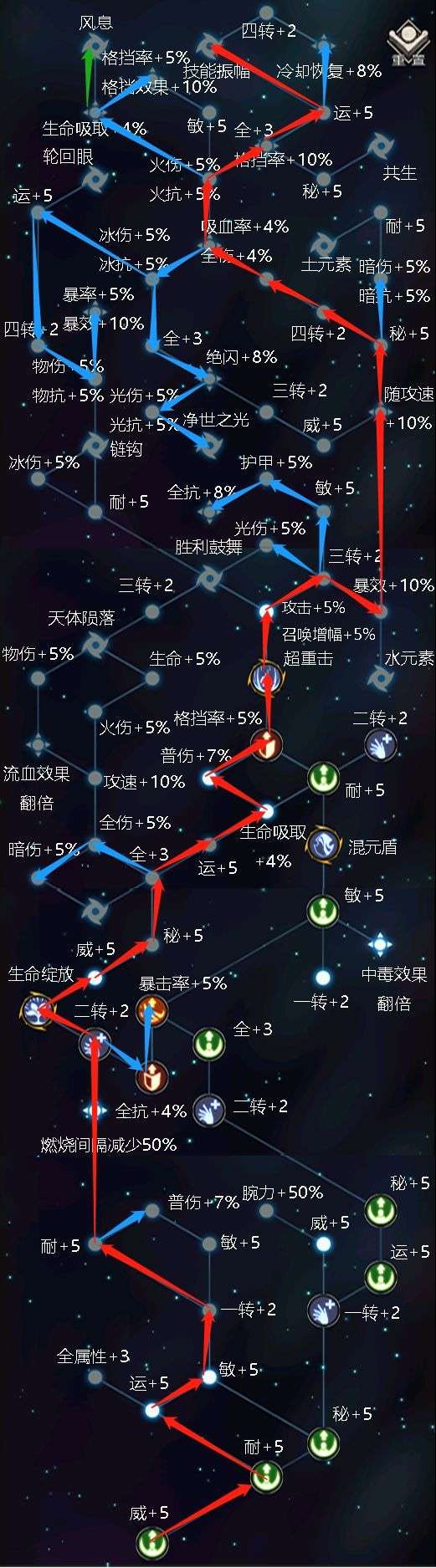受到伤害降低--运--攻击力--格挡/冷却--生命吸取--物抗/法抗