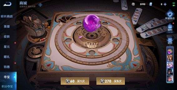 我们优化了水晶商店的展示方式,点击夺宝界面右侧“荣耀商店”入口进入荣耀商店界面,召唤师可在该界面内直接查看水晶商店内奖励皮肤和英雄的模型和出场动画等展示内容。