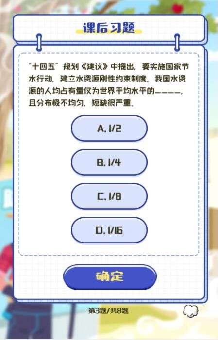 3、“十四五”规划建议中提出,要实施国家节水行动,建立水资源刚性约束制度。我国水资源的人均占有量仅为世界平均水平的多少,且分布极不均匀,短缺很严重。