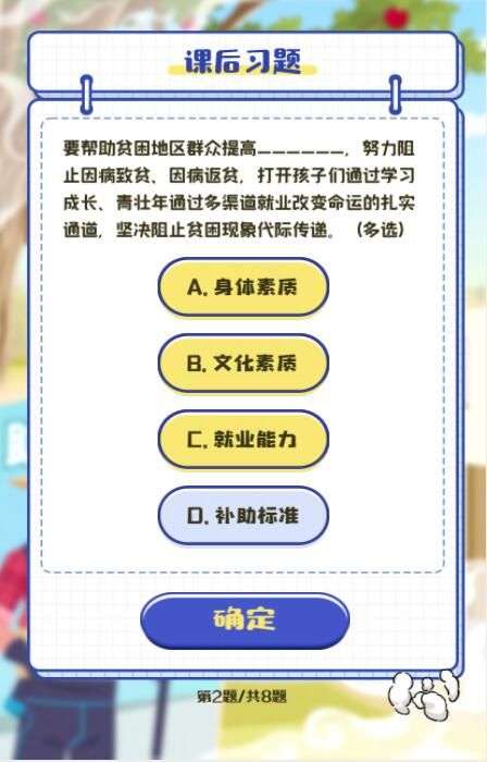 2、要帮助贫困地区群众提高___,努力阻止因病致贫,因病返贫,打开孩子们通过学习成长、青壮年通过多渠道就业改变命运的扎实通道,坚决阻止贫困现象代际传递。(多选)