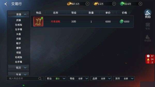 3、自由买卖交易行系统: 当玩家等级达到60级时,即可开启交易行。点击屏幕上方的交易行,可进入主界面。在这里玩家可以看到三个板块,分别是竞拍、寄售、待领取。