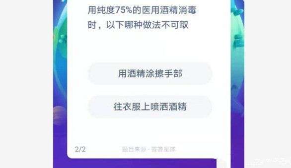 用75%酒精消毒蚂蚁庄园答案是什么?用纯度百分之75的酒精,我们使用的时候一定要注意谨慎哦,因为酒精纯度越高,其产生的可燃性质就越大呢,那么使用医用酒精不可取的做法是什么呢,现在就来告诉给大家正确答案吧~