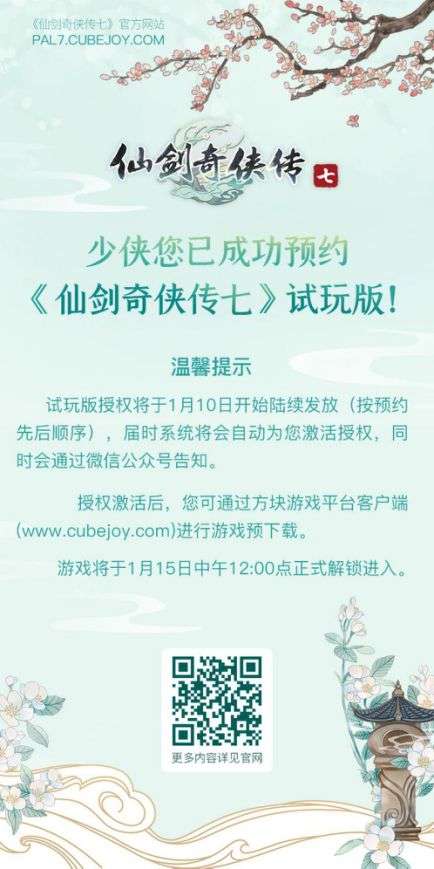 预约成功后,试玩版授权将按照预约顺序于1月10日开始陆续发放,届时方块平台将会自动为玩家激活授权,微信公众号也会发布游戏预下载通知,试玩版将于1月15日中午12:00正式解锁。