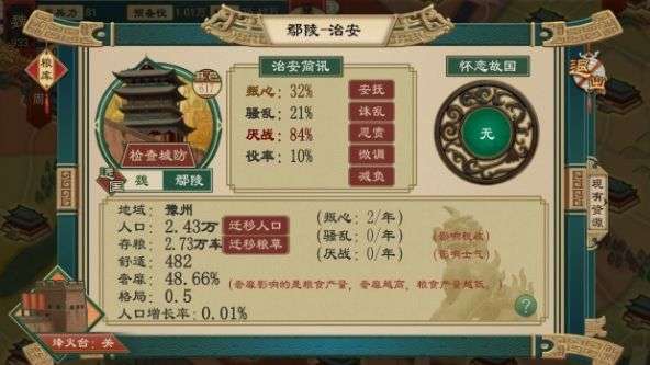 骚乱:受到赋税政策影响,过高的叛乱会导致税收大大减少,可以通过【诛乱】或者开启【免税】来减少叛乱。