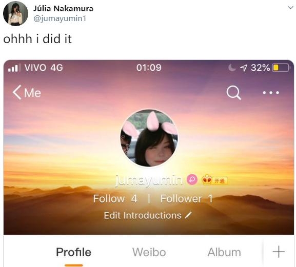 短暂的一天时间里,远在巴西的Mayumi就感受到了国内很多粉丝在社交媒体上对她的喜爱,第一时间也是用中文感谢了大家的支持。大概是有玩家在Mayumi的社交媒体下 流言邀请她来到中国的社交平台,所以Mayumi很快就注册了一个微博: