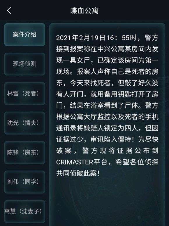 2021年2月19日16:55时,警方接到报案称在中兴公寓某房间内发现一具女尸,已确定该房间为第一现场。报案人声称自己是死者的房东,今天来找死者,但敲了好久没有人开门,就用备用钥匙打开了房门,结果在浴室看到了尸体。警方根据公寓大厅监控以及死者的手机通讯录将嫌疑人锁定为四人,但因证据过少,审讯陷入僵持!为尽快破案,警方现将证据公们到CRIMASTER平台,希望各位侦探共同侦破此案!