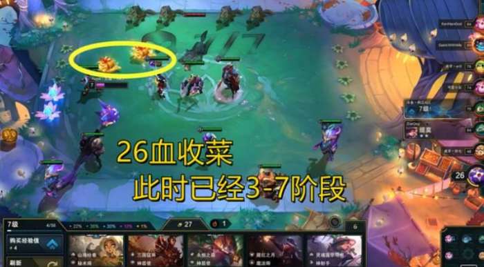 这一局开局红莲并没有拿到强力的打工天选,所以他依然选择了空城打法。到了3-2阶段,他D了很久也没有找到合适的天选,于是直接选择继续走福星连败。此时的第一名还是近乎满血的状态,红莲仅仅只有50血,一般人真不敢这么玩。