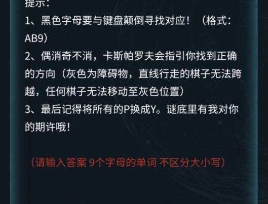 卡斯帕罗夫是国际象棋大师,所以提示2中的棋子应该是指的国际象棋的走法。