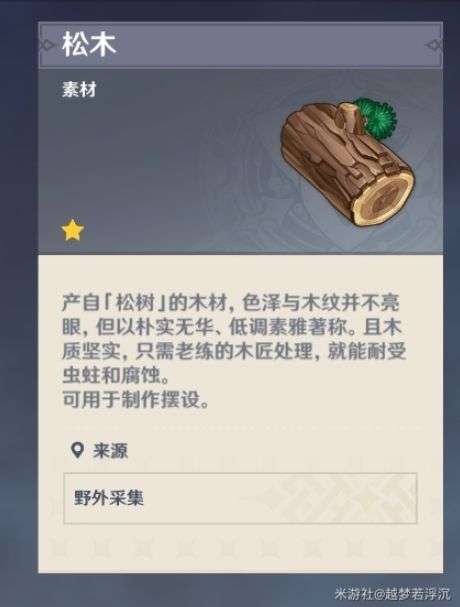 松木:教程推荐地点是龙脊雪山,但是雪山有严寒气候,而且松树的分布比较分散,又免不了和丘丘人冲突。