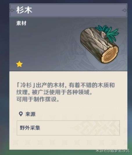 杉木:冷杉也是松科植物,所以经常能在下面捡到松果,地点推荐同样是蒙德城,靠教堂的城墙外都是哦。砍完松树就能去。