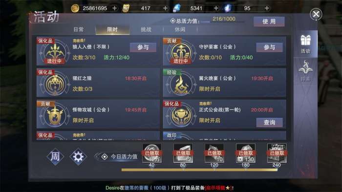 此外,参与一些限时活动也能获得不少的资源,比如炼金初试是每天12:30开启,篝火晚会每天19:30开启,而像炼金复试、炼金终试、公会竞速、神祠盛宴会在特定的时间开放,大家有空的话都可以参与下,因为可以获得额外的经验值和奖励。