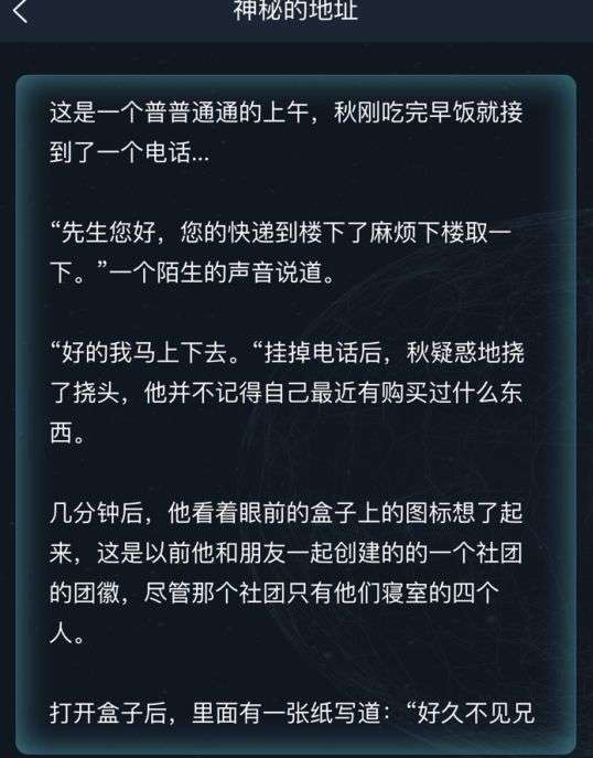 犯罪大师神秘的地址答案怎么解析,这个是6月25日上线的一个案件,不少人对于此都不是很了解的,需要大家去找到快递盒子才行,具体的规律是怎么样的,下面就来介绍下犯罪大师神秘的地址答案是什么。