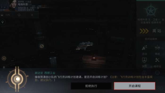 在完成教程后,我们的克隆飞行员获得了属于自己的执照,新伊甸之旅正式开始,游戏开始时,玩家会在一处空间站中,并且会收到一份系统的提示,是否要参加新手飞行员训练课程。