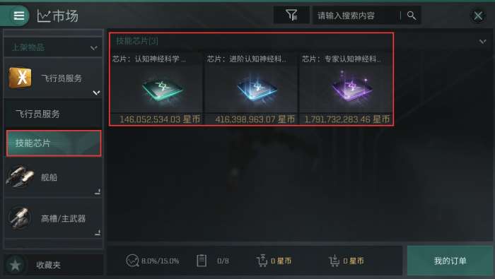 除了通过氪金购买外,玩家还可以在游戏的市场内购买玩家售卖的技能学习芯片,只要努力赚取ISK,就可以不花钱的白嫖学习芯片加速技能升级的速度。