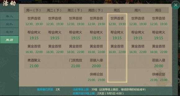 ③定时活动,定时活动是玩家提升自己个人人物属性,获取道具材料、高阶装备的途径,其中首领相关的活动,想必玩家肯定也懂了吧,击杀得到的装备道具等,可是这个游戏内最粗暴的,成为一方豪杰,那么在定时活动开启的时候,一定要参与,切记切记。同时定时活动里的帮派烤火,大家已经加入帮会的侠士千万不要错过哦,这个任务给予的经验可是很夸张的哦。